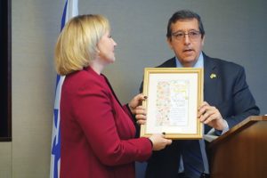 Lt. Gov. Kim Guadagno receives a “Woman of Valor” plaque from Mark Levenson, chair of the New Jersey-Israel Commission. Photo by Robert Wiener Eleven days before leaving office, Lt. Gov. Kim Guadagno bade a tearful farewell to members of the New Jersey-Israel Commission (NJIC). At its Jan. 5 meeting in Newark, she told the group that… Read the rest of this entry »