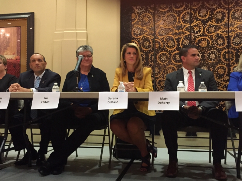 Deputy Freeolder Director Serena DiMaso was challenged by her Democrat opponent, Sue Fulton, to declare her differences with the Republican National Platform at a candidates forum on Thursday night at the Four Seasons 55+ community in Manalapan.