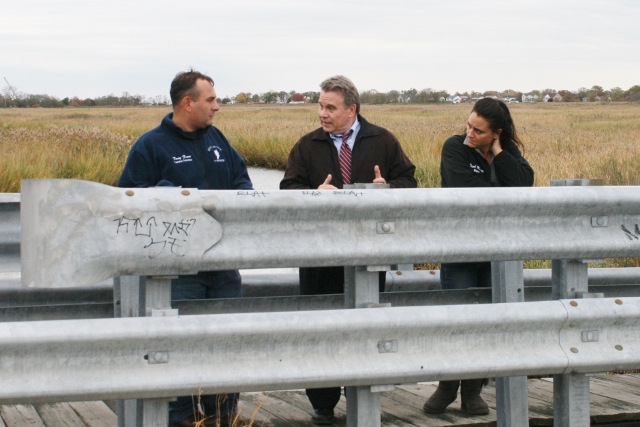 Middletown Committeman Tony Fiore, Congressman Chris Smith and Middletown Mayor Stephanie Murray inspect the Bay Ave Bridge on the second anniversary of Superstorm Sandy, October 29, 2014. MMM file photo