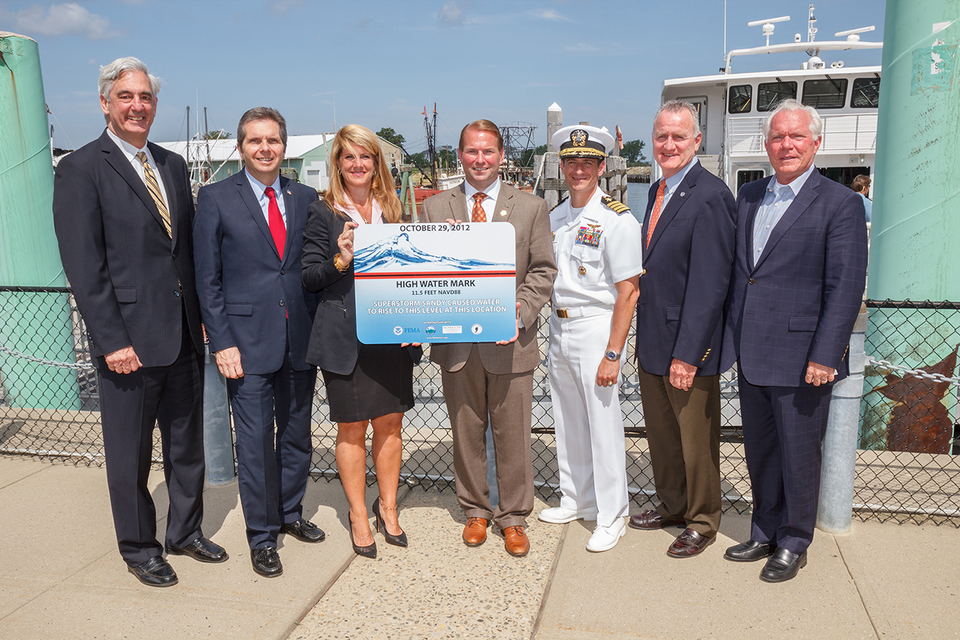 A countywide collaboration with Monmouth County’s government, FEMA, Monmouth University Urban Coast Institute, New Jersey Sea Grant Consortium, National Park Service, Jacques Cousteau National Estuarine Research Reserve at Rutgers University, Navy Weapons Station Earle, New Jersey Department of Environmental Protection and Verizon designed to raise the public’s awareness of flood risks and to encourage the mitigation of those risks was launched this morning in Middletown with the installation of a High Water Mark (HWM) sign at the Belford Ferry Terminal.