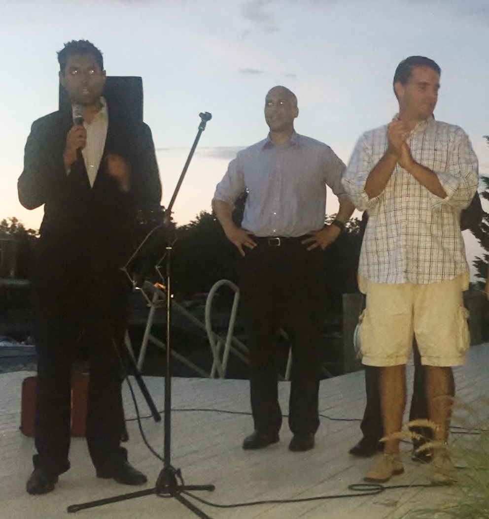 Vin Gopal speaks at Doherty fundraiser while Sen Cory Booker and Matt Doherty look on. photo via facebook