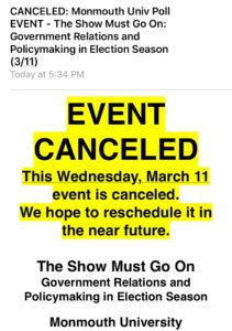 Monmouth University has cancelled an event scheduled for March 11 entitled Show Must Go On: Government Relations and Policymaking in Election Season.