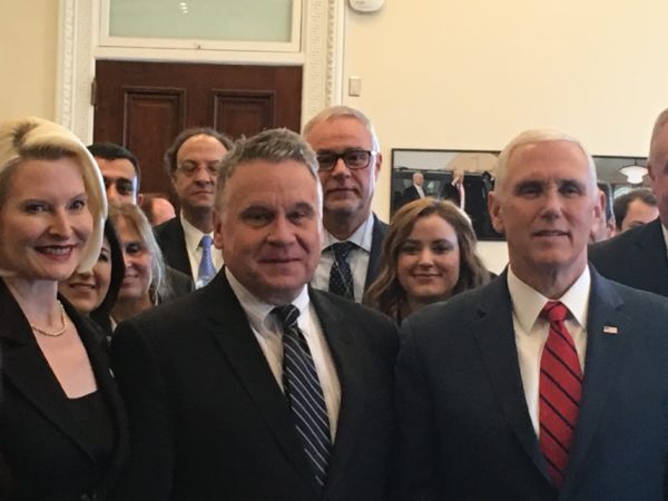 Callista Gingrich, Ambassador to the Holy See, Rep Chris Smith and Vice President Mike Pence at the White House for the bill signing ceremony