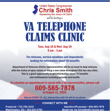 Congressman Chris Smith and the Veterans Administration are hosting Telephone Claims Clinics for military veterans, active duty personnel and their families on August 18 and 19.