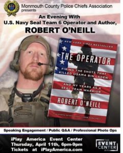 Posted: April 6th, 2019 | Author: admin | Filed under: Monmouth County, Monmouth County News, New Jersey, Things to do in Monmouth County | Tags: iPlayAmerica, Monmouth County Chiefs of Police Association, Monmouth County News, Monmouth County Police Chiefs Association, Osama Bin Laden, Robert O'Neill, Seal Team 6 | Comments Off on Robert O’Neill, American Hero To Appear at iPlayAmerica on Thurs, April 11