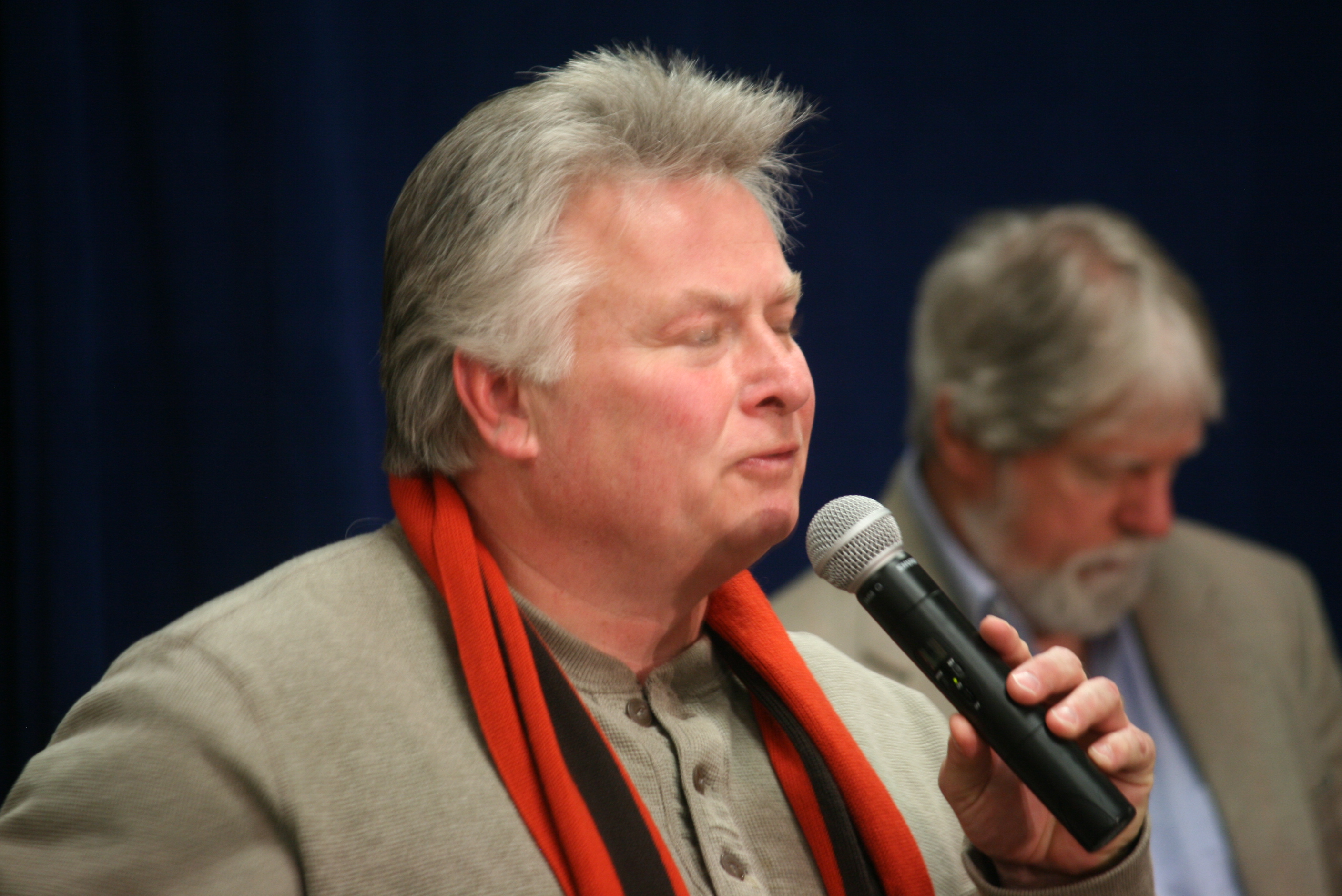 Thomas J Largey of Sea Bright questions Governor Christie abouth Hammerman & Gainer Inc at Middletown Town Hall Meeting on Feb 20,2013. Asbury Park Press Editor Randy Bergmann in background.