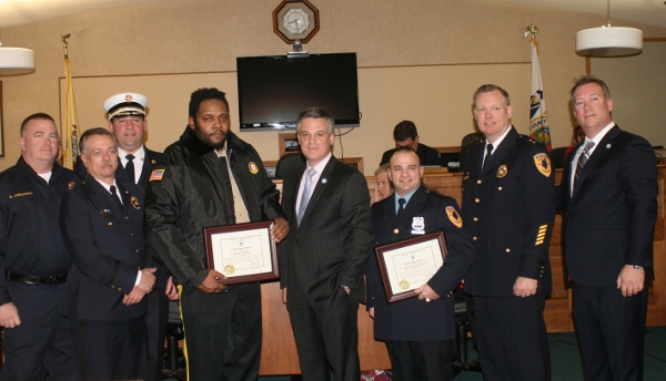 Mayor Kevin Settembrino and the Middletown Township Committee honored Keith Thornton, a Security Officer with Marion Security Agency and Patrolman Nicholas Manochio for their heroic efforts in rescuing Gladys Bowden, 88, from her burning home in Shadow Lake Village on Saturday night, December 15.