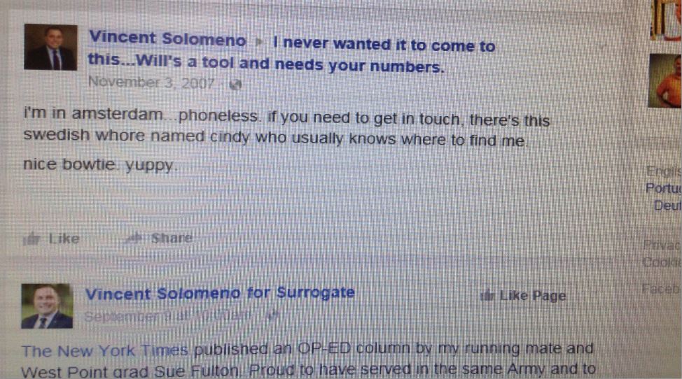 Solomeno was the poorest performing Democrat on the County ticket last year, losing badly to Surrogate Rosemarie Peters by a margin of 58%-42%. He performed slightly better in his hometown of Hazlet where he lost to Peters, of Middletown, by 56% to 44%, while losing every election district in the township. His effort last year was hampered when he denied using prostitutes after a facebook post wherein he announced that a “swedish whore name Cindy usually knows where to find me” was discovered online.