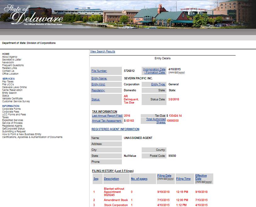 The candidate reported that his company, Severn Pacific Inc., was dissolved in his Financial Disclosure Statement filed with the Clerk House of Representatives on March 11, 2018, the day after MMM reported that he was delinquent in filing that report. His FDS says he was the CEO of the company.