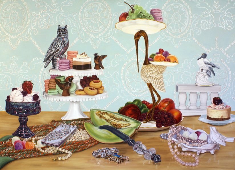 Lisa Ficarelli-Halpern, Still Life with Birds and Desserts, oil on canvas, 36” x 50”