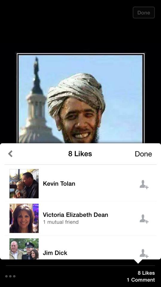 Mrs. Dean told MMM that she has not seen the photo, that she has no recollection of liking such a photo and that her facebook posts and likes are only viewable by her “friends.” She said that there is no way that Elmansoury could have accessed her facebook timeline or news feed “a couple of days ago,” and that she suspects the Obama photo with her ‘like’ is a fabrication.