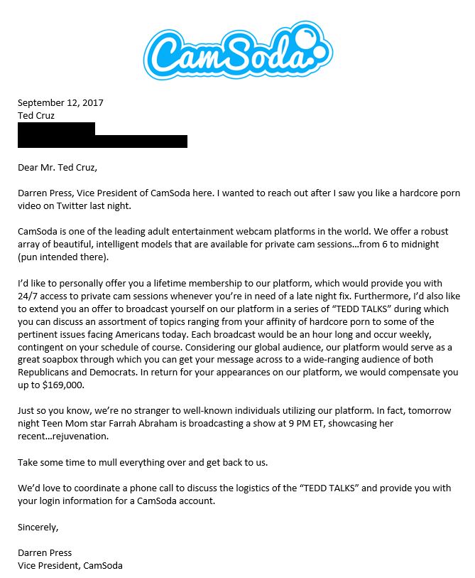 The offer from Darren Press, VP of CamSoda, follows the news of a hardcore video being “liked” by Cruz’s official twitter account.