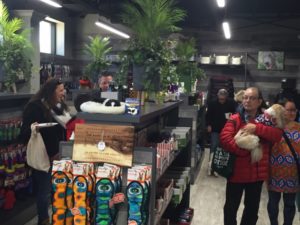 The lobby was crowded with happy human and canine visitors. Welcoming employees uniformed in black, white and green were offering tours and distributing gifts. It is a nicer lobby than that of many hotels I’ve visited, complete with a front desk and gift shop…they call it the Pawtique.