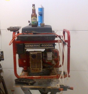 You put your generator away after Irene, carefully stored in your shed under a tarp, in fact. With the emergency, it’s time to haul it out and keep the lights on. Cool, still more than half a tank full. Fuel tap on, choke on, switch on. And yank.